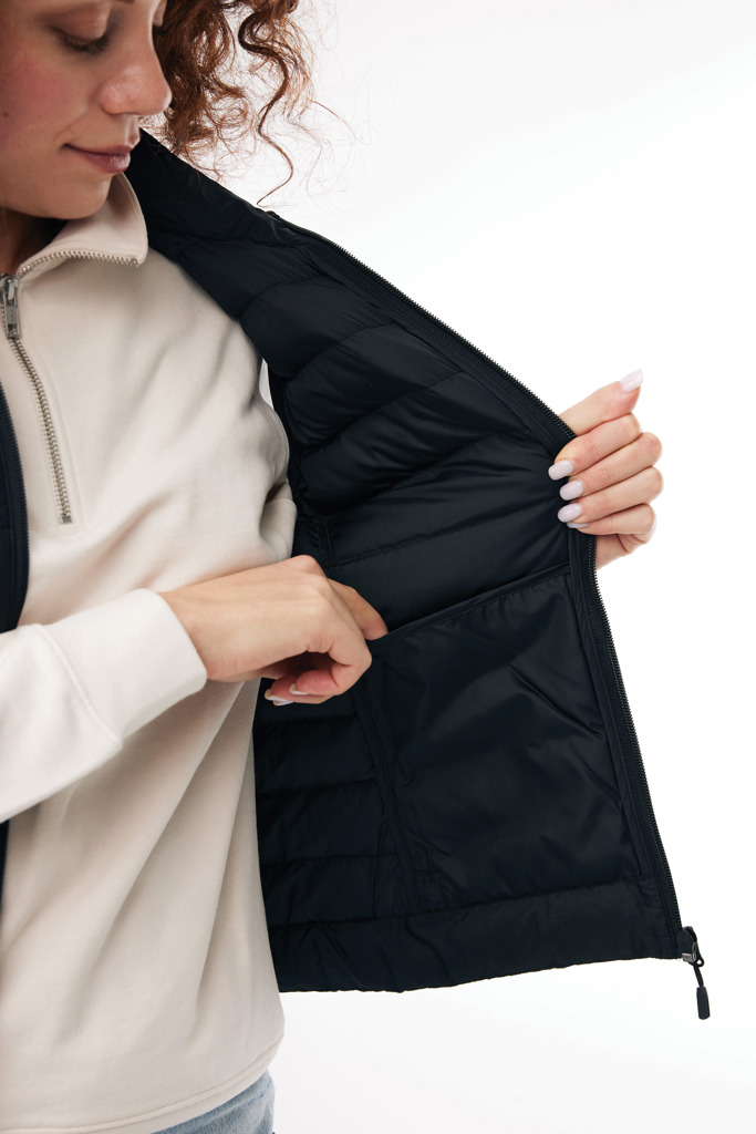 Women’s medium fit bodywarmer made from 100% post-consumer recycled polyester. The bodywarmer is fully quilted with 100% recycled polyester pearl filling. It has a reversed zipper at the front and practical zip pockets in the side panel seams. All zippers have extra zip pullers in matching colour for a refined look. The armholes have elastic binding and all seams at the inside are clean finished with recycled binding. Fluorine/PFAS free water repellent impregnation. The use of genuine recycled fabric materials and environmental impact claims are guaranteed, by using the AWARE™ disruptive physical tracer and blockchain technology. By scanning the QR code, you will gain access to a dedicated digital passport. 2% of proceeds of each sold product will be donated to Water.org. This product is OEKO-TEX® STANDARD 100 certified. The Meru bodywarmer is also available in men fit.
